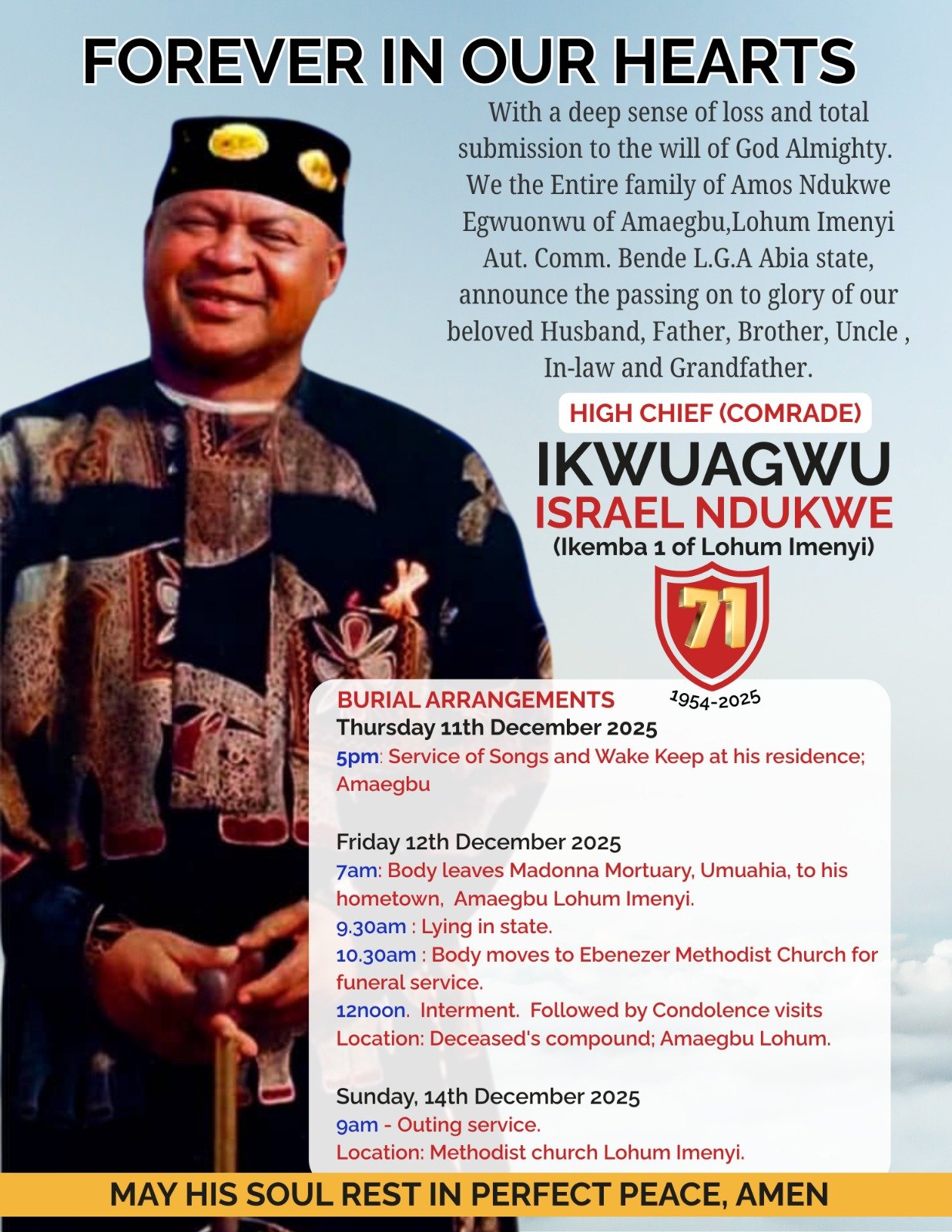 The family of Chief N. O. Okoro announces his burial scheduled for Friday at his residence in Umuimenyi. A service